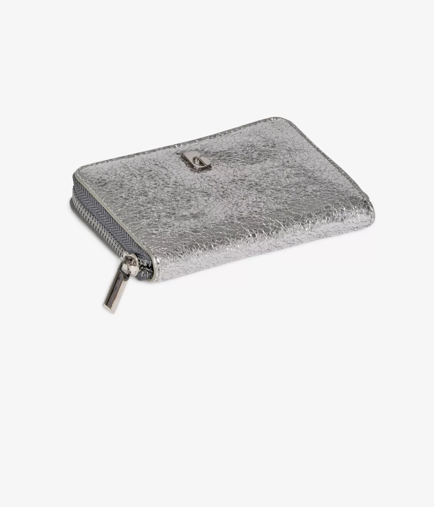 Un sublime porte-monnaie argent en cuir métallisé aspect craquelé. Ce porte-monnaie femme, orné d’un logo en méta…