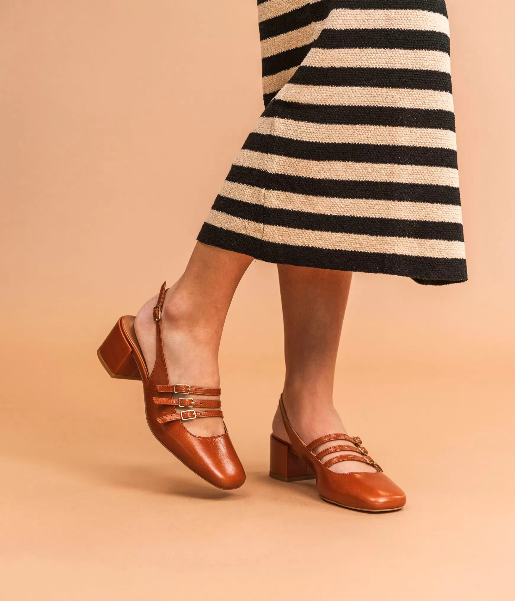 Une babies Sling-back en cuir lisse cognac fabriquée avec soin au Portugal. Hit mode de la saison, elle joue l’accumu…
